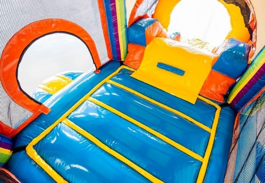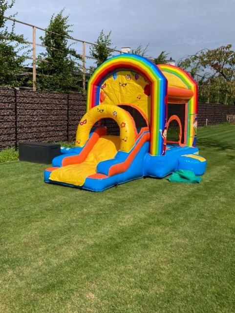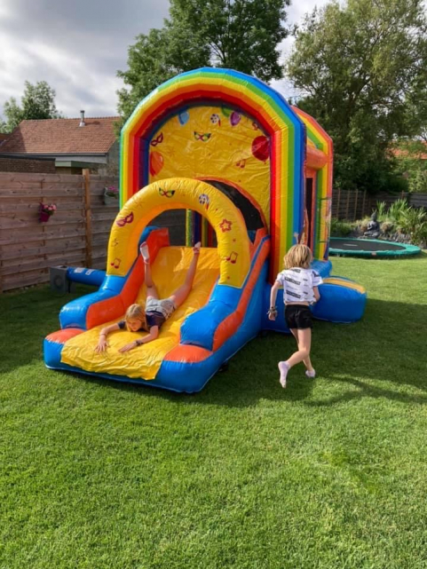 Dit overdekte springkasteel past vrijwel in elke achtertuin of bijvoorbeeld op de oprit.